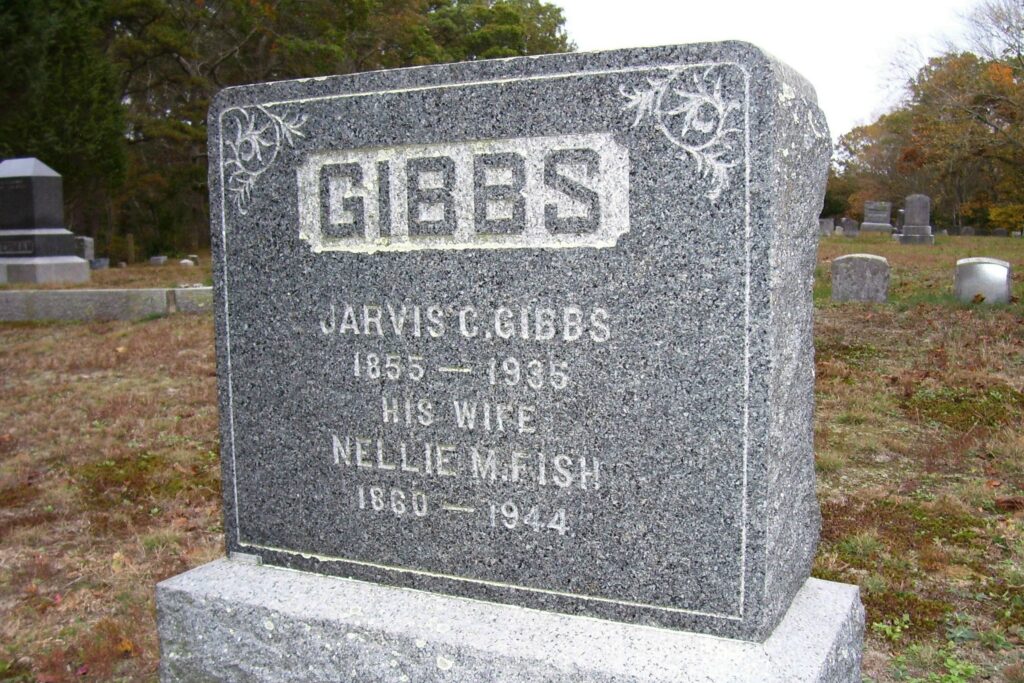 - 1. Jarvis Cushman Gibbs, Jr.; (April 17, 1880 – April 2, 1962); Married (1) Mabel F. Robinson (1878 – ?) (Edwin F. Robinson & Harriet/Hattie A. Hamilton) in Falmouth Ma. on March 15, 1899 & married (2) Helen/ Nellie Agnes Leahy (1885 – 1979) (Michael Leahy & Bridget Carol) in Pittsfield Ma. in 1926; Jarvis, Jr. & Helen/Nellie are buried in Pocasset Cemetery.